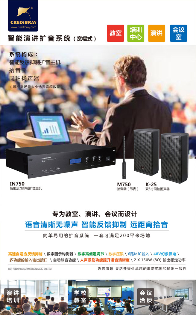 1. IN750系统主机采用自适应反馈抑制、数字均衡等技术,实现远距离拾音。 |