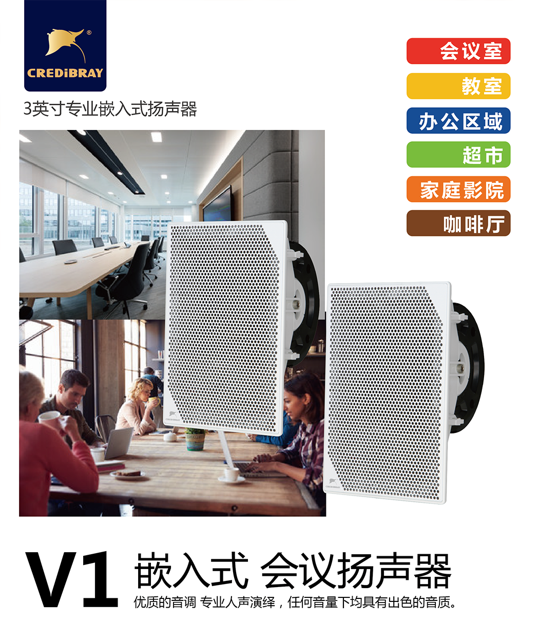 V1 紧凑型全频扬声器设计具有更广泛的适用性。V1具有宽广、高质量的音调,非常适合会议室使用。设计结合了美观和性能,可嵌入式安装。